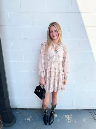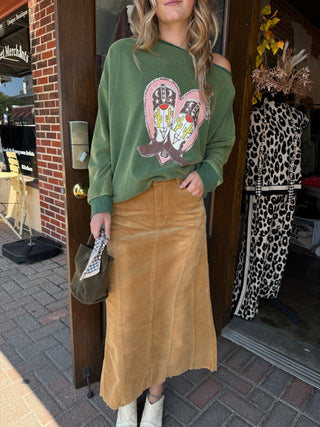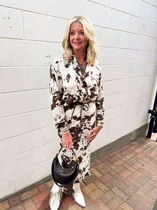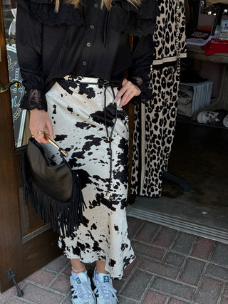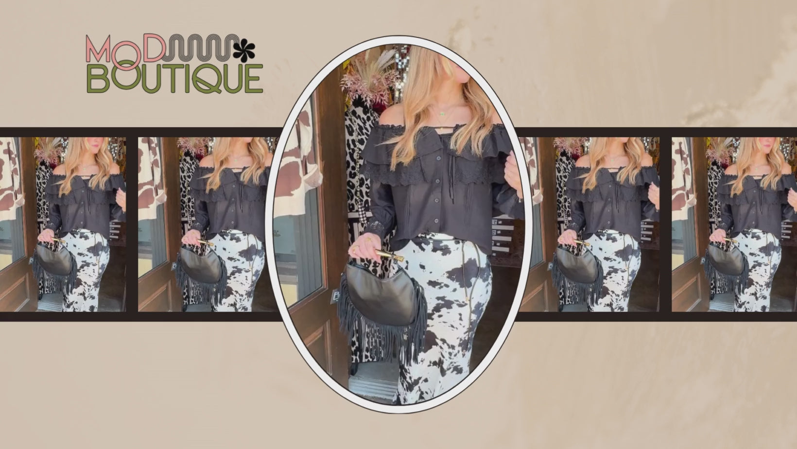 Embrace the stunning contrast of the Western Romance look. This outfit fuses period drama with rugged charm, featuring a beautifully detailed Victorian-inspired ruffled blouse that speaks to old-world sophistication. Below, a sleek, modern cowhide satin skirt provides a powerful, textural counterpoint. It’s a bold fashion statement that captures the spirit of the frontier with a luxurious, dramatic flair. Perfect for the woman who finds beauty in the unexpected.
