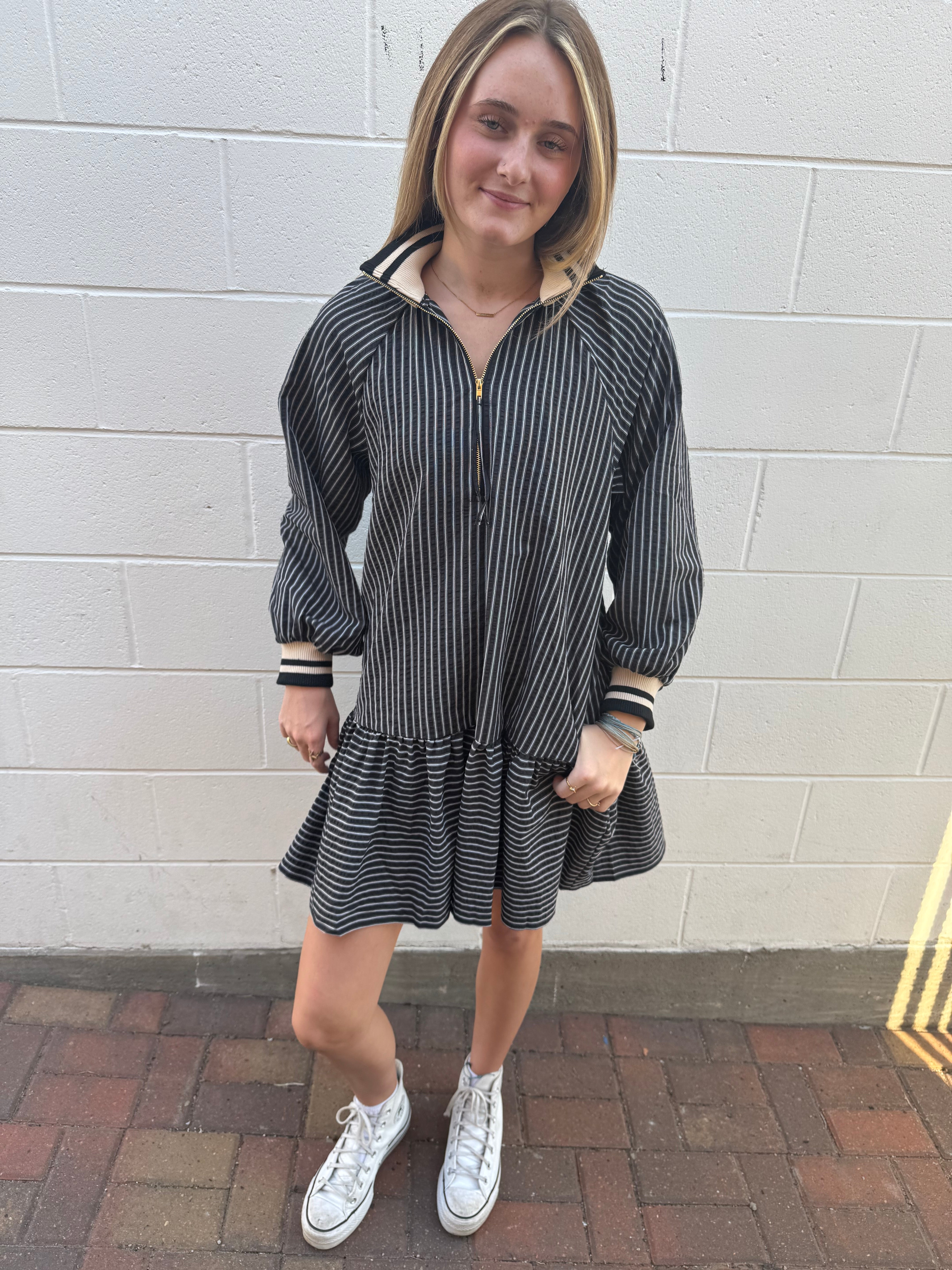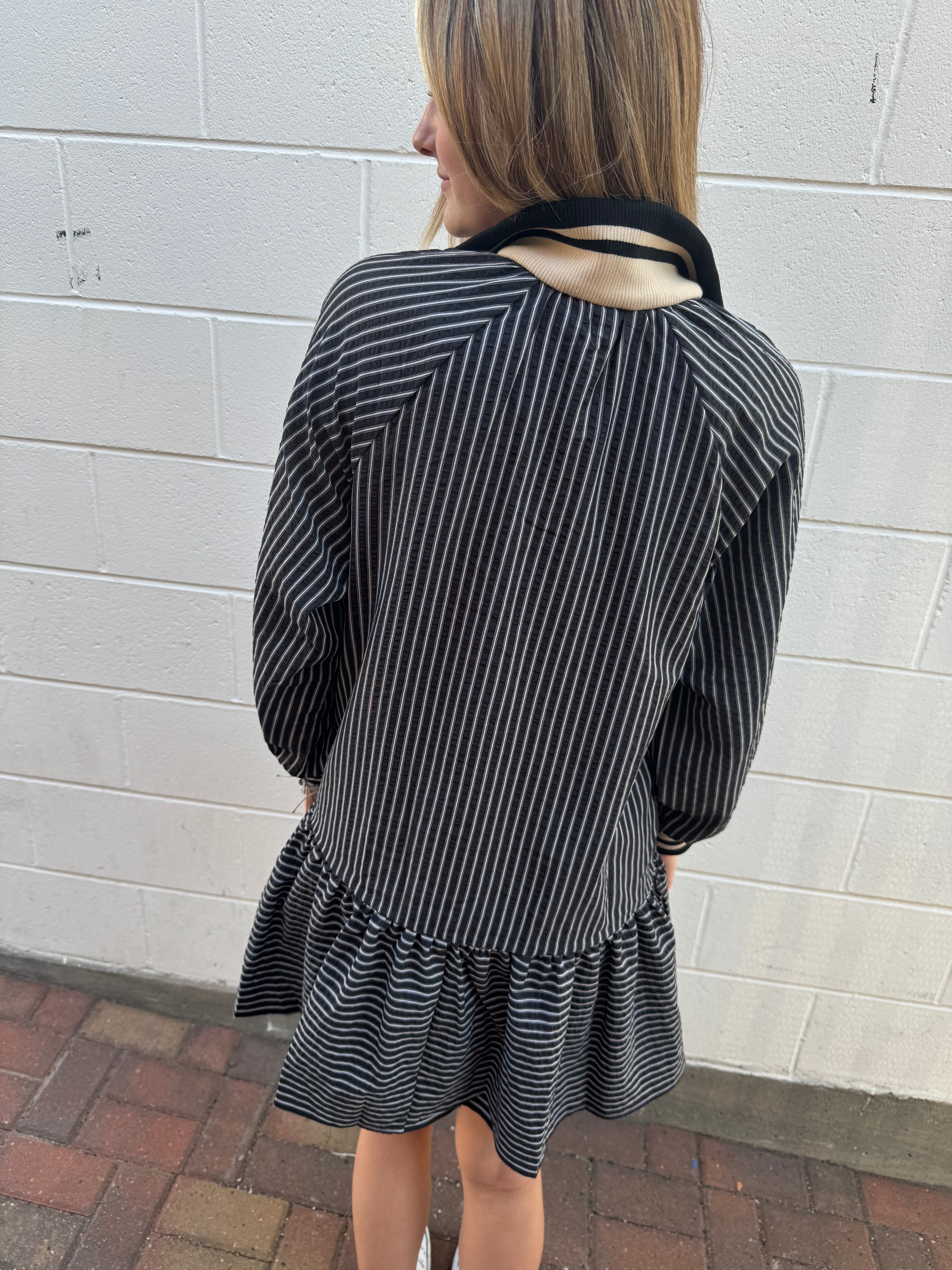 Embrace tailored confidence in this contemporary Black Pinstripe Mini Dress. This piece offers a structured, yet effortless look, perfect for work, weekends, or date night.