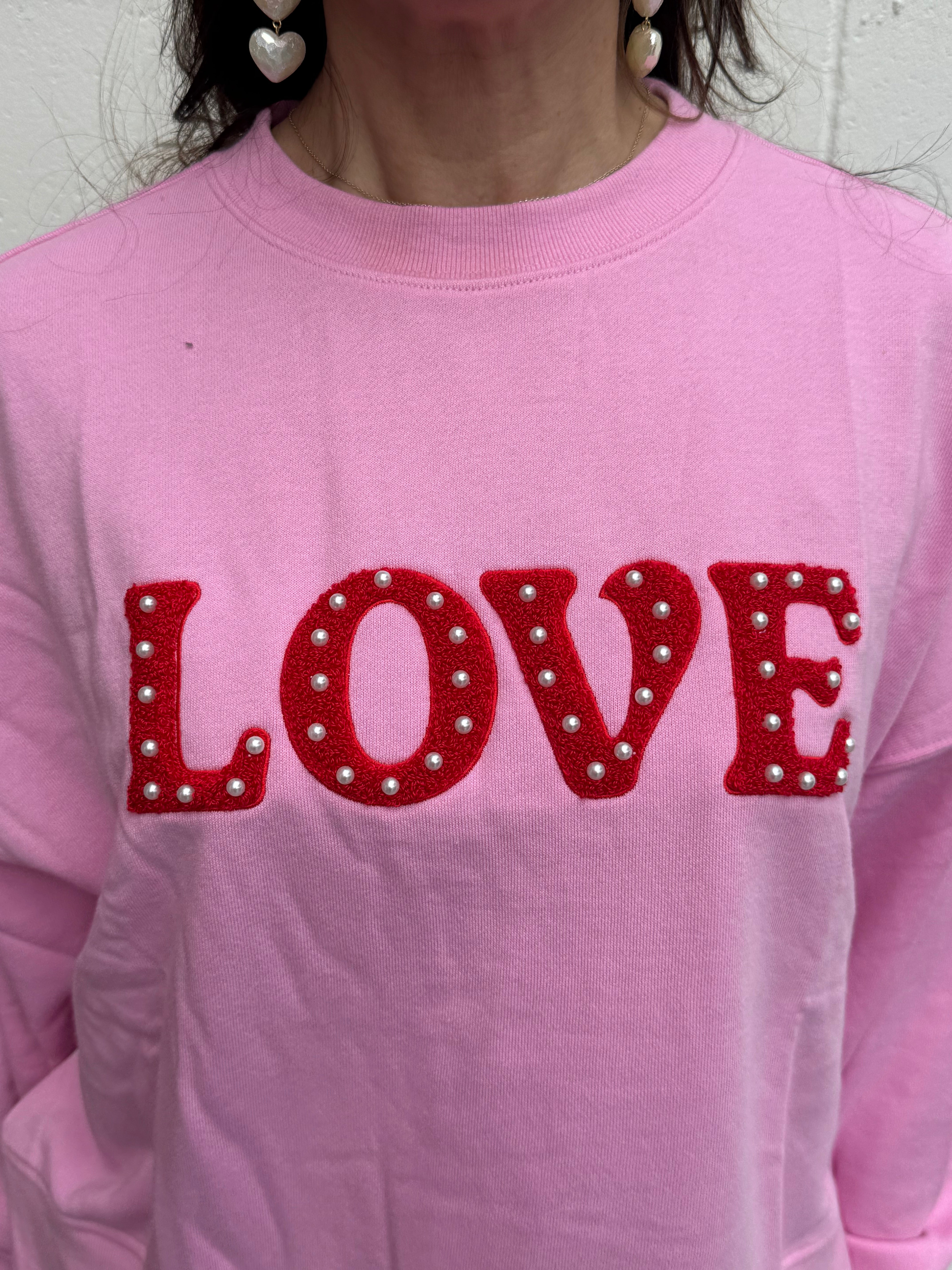 Fall in love with your new favorite layer. Featuring a bold "Love" patch on a soft, rosy pink fabric, this sweatshirt is designed for those who believe in romance and comfort. Perfect for pairing with ribbons, denim, or your favorite skirt for an effortlessly cute look.