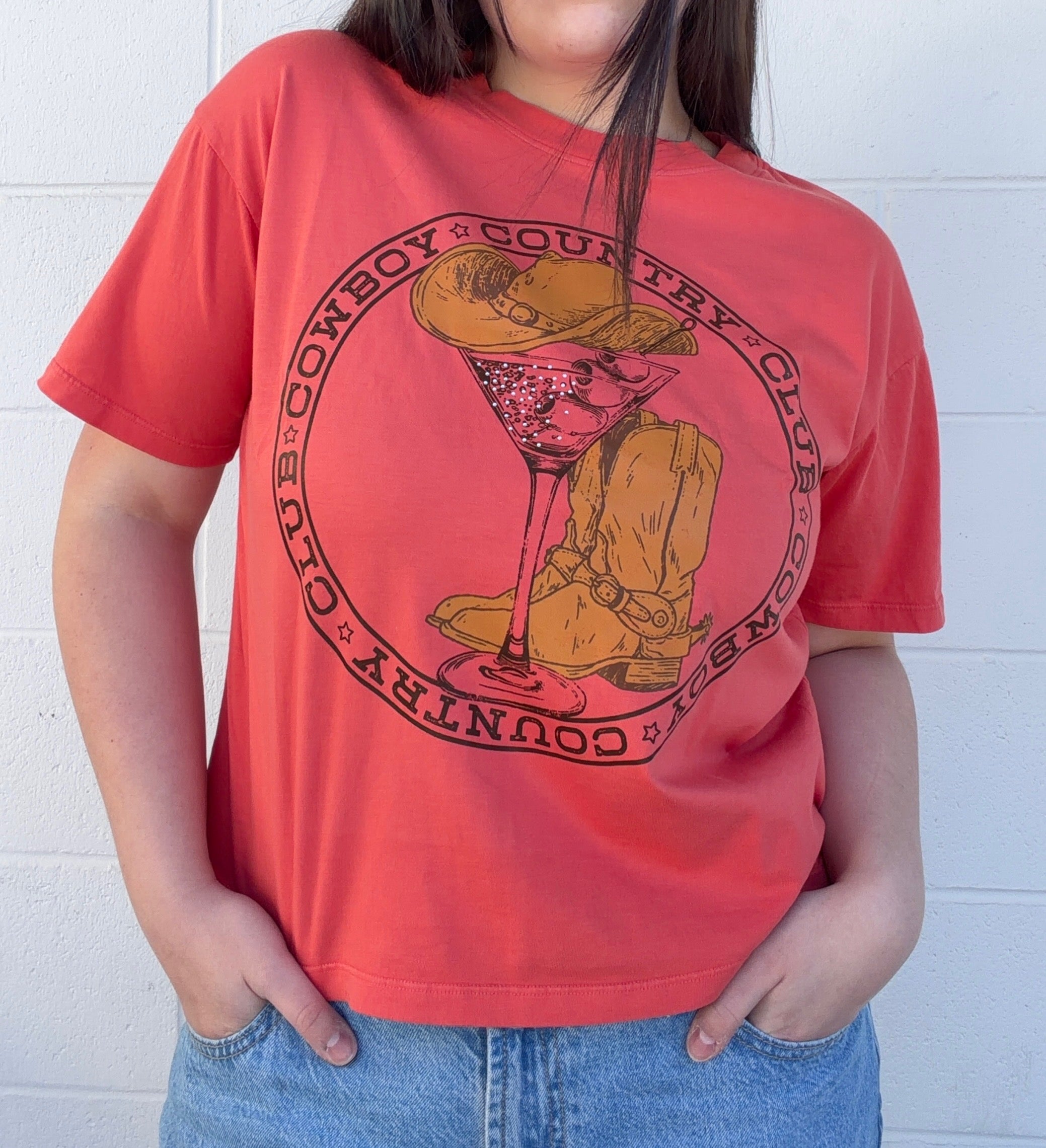 The Country Club Crop Description: Upgrade your rodeo rotation with the Country Club Western Tee. Featuring a chic contrast between rugged leather boots and a sophisticated martini, this piece is elevated with hand-placed sparkling accents. Its cropped, boxy fit makes it the ideal partner for high-waisted denim or a silk midi skirt. Love bling boots graphic crimson colored