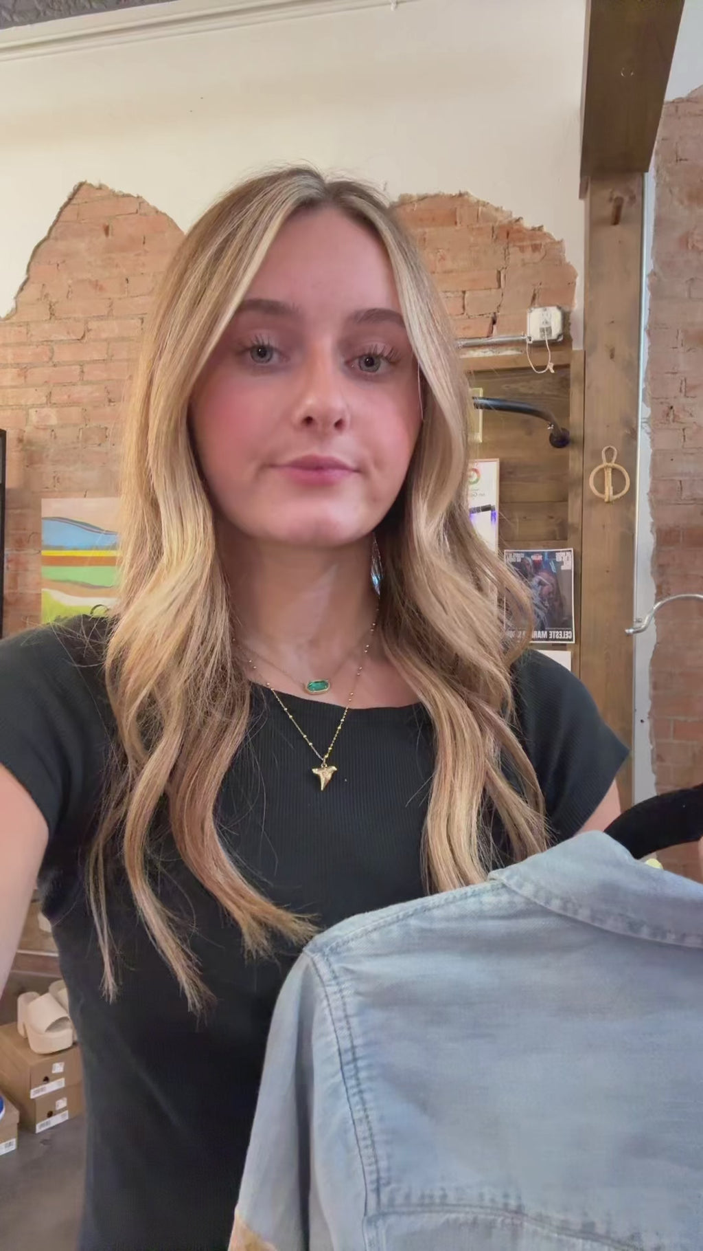 Handcrafted denim chambray button-up with snap buttons & unique rhinestone detail. Custom patch, unique stitching, and treatments ensure a one-of-a-kind feel.Each piece is custom-treated for a unique look.