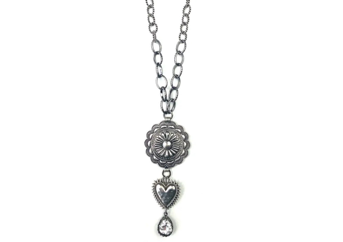 Mixed Chain Necklace with Concho and Sacred Heart Pendant Drop—Make a statement with this unique, bohemian-inspired piece. This necklace features a bold mix of different chain styles, accented by an intricate concho charm and a striking Sacred Heart pendant drop. Perfect for layering or wearing solo.