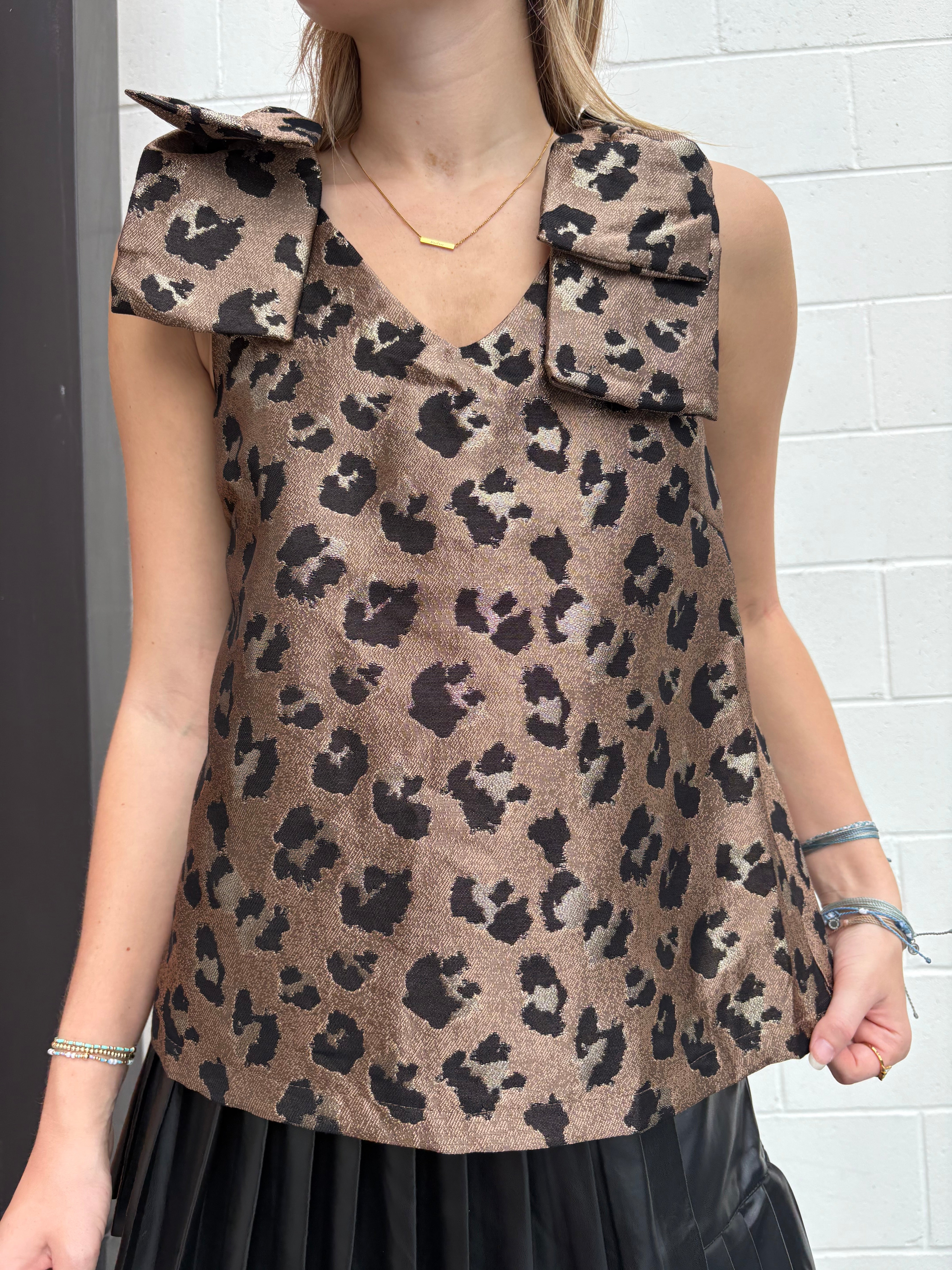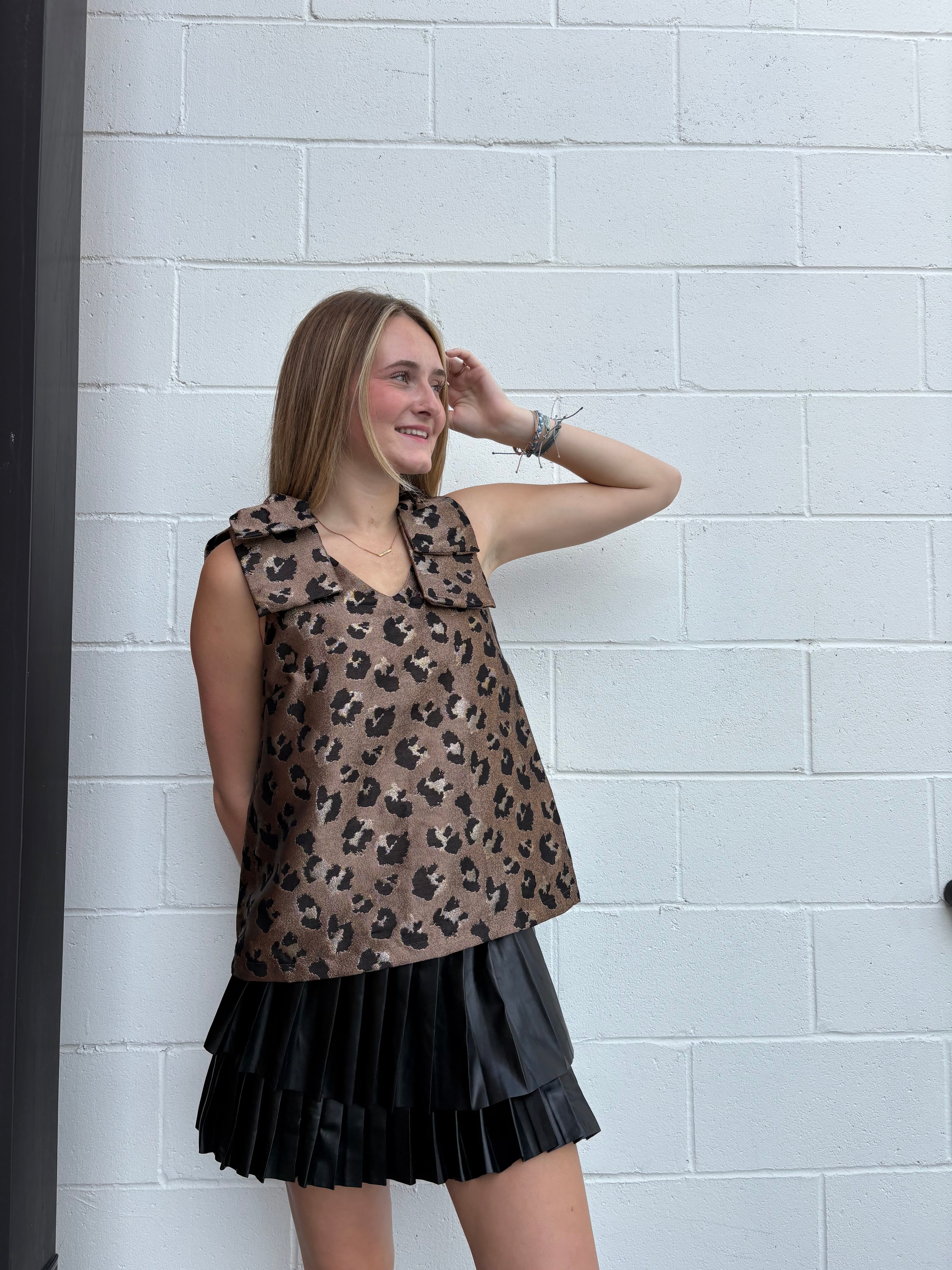 Unleash your wild side! Shop this chic leopard print sleeveless top featuring a flattering V-neck and elegant layered flap shoulder detail. Lightweight, woven, and fully lined for comfortable, non-sheer style. 100% Polyester.