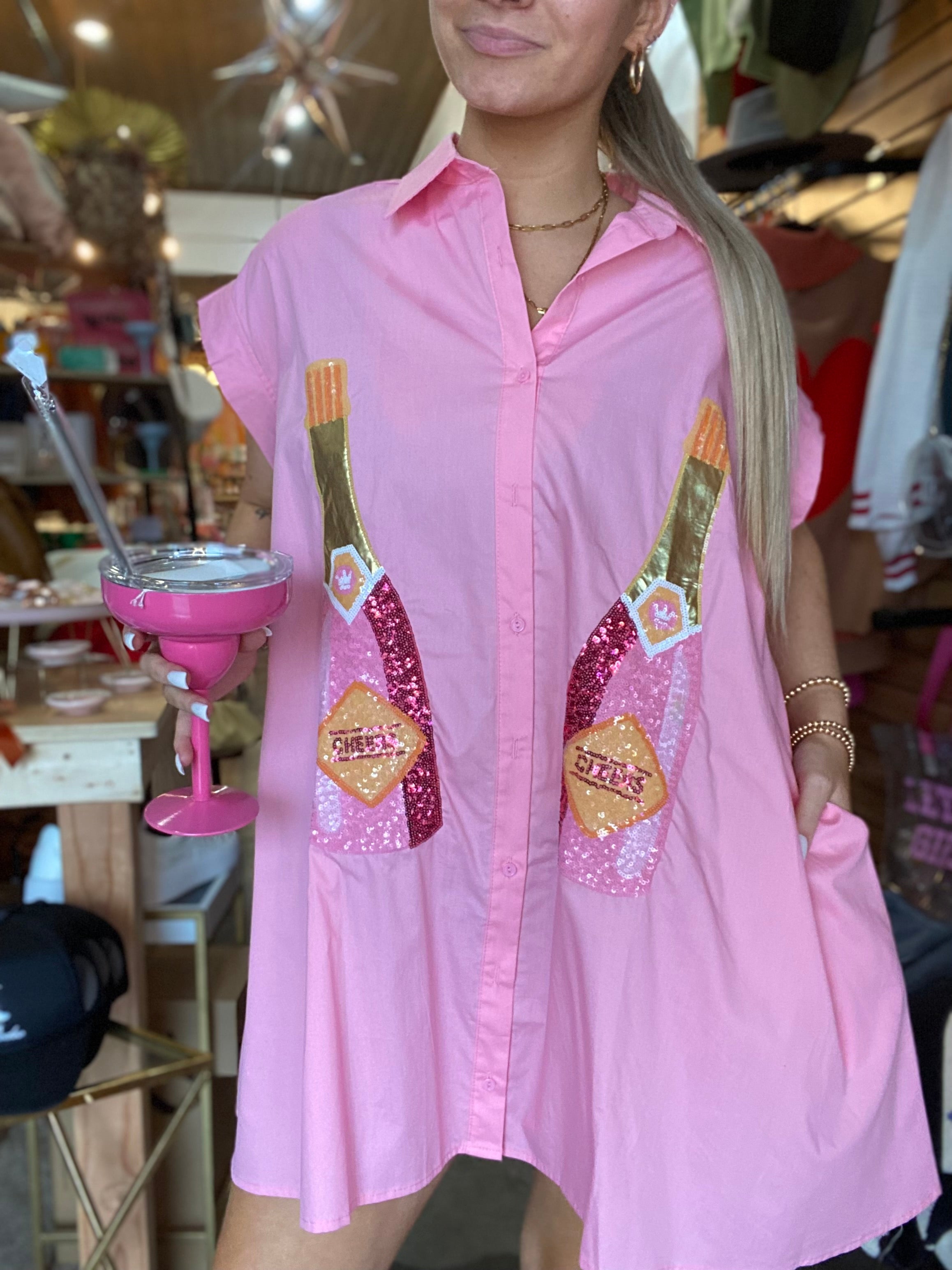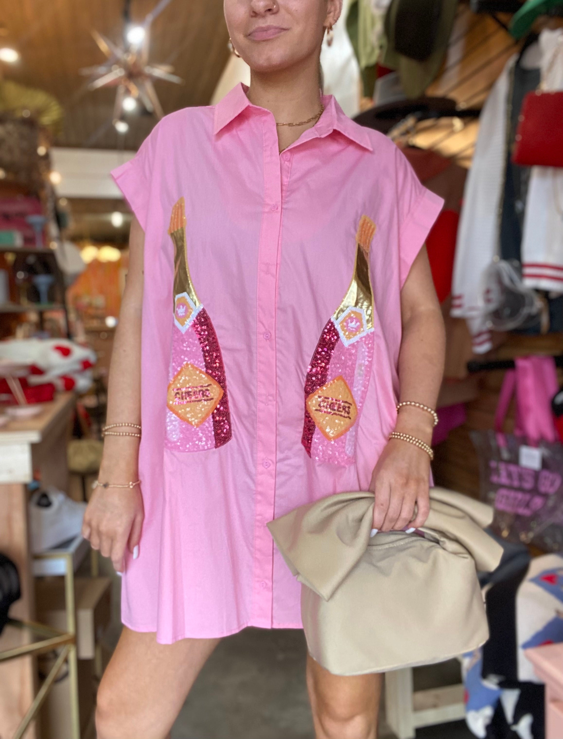 Pink champagne anyone! Make a statement in this short-sleeve A-line flare mini dress. The playful pink sequin fabric is detailed with dazzling metallic gold champagne bottle embroidery. Button-down style—glamorous, fun, and totally unforgettable.