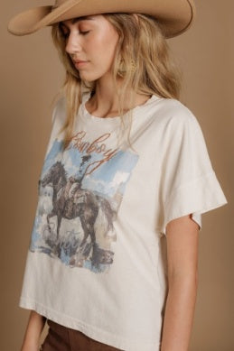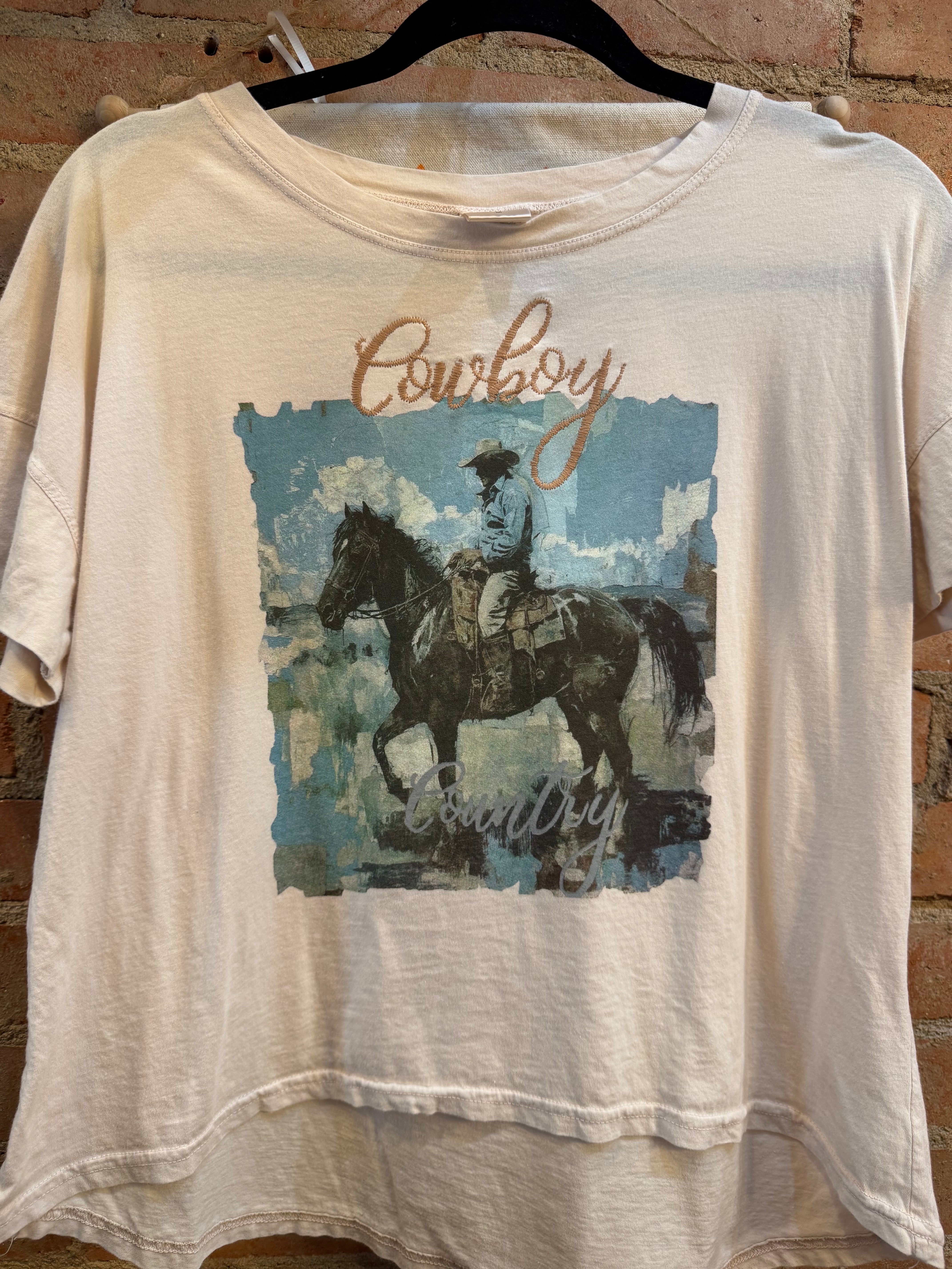 The Embroidery: Overlaid or positioned nearby is the word "Cowboy" in bold, tactile embroidery. The stitching adds a layer of craftsmanship and physical texture that sets it apart from a standard printed tee, giving it a high-quality, boutique finish.
