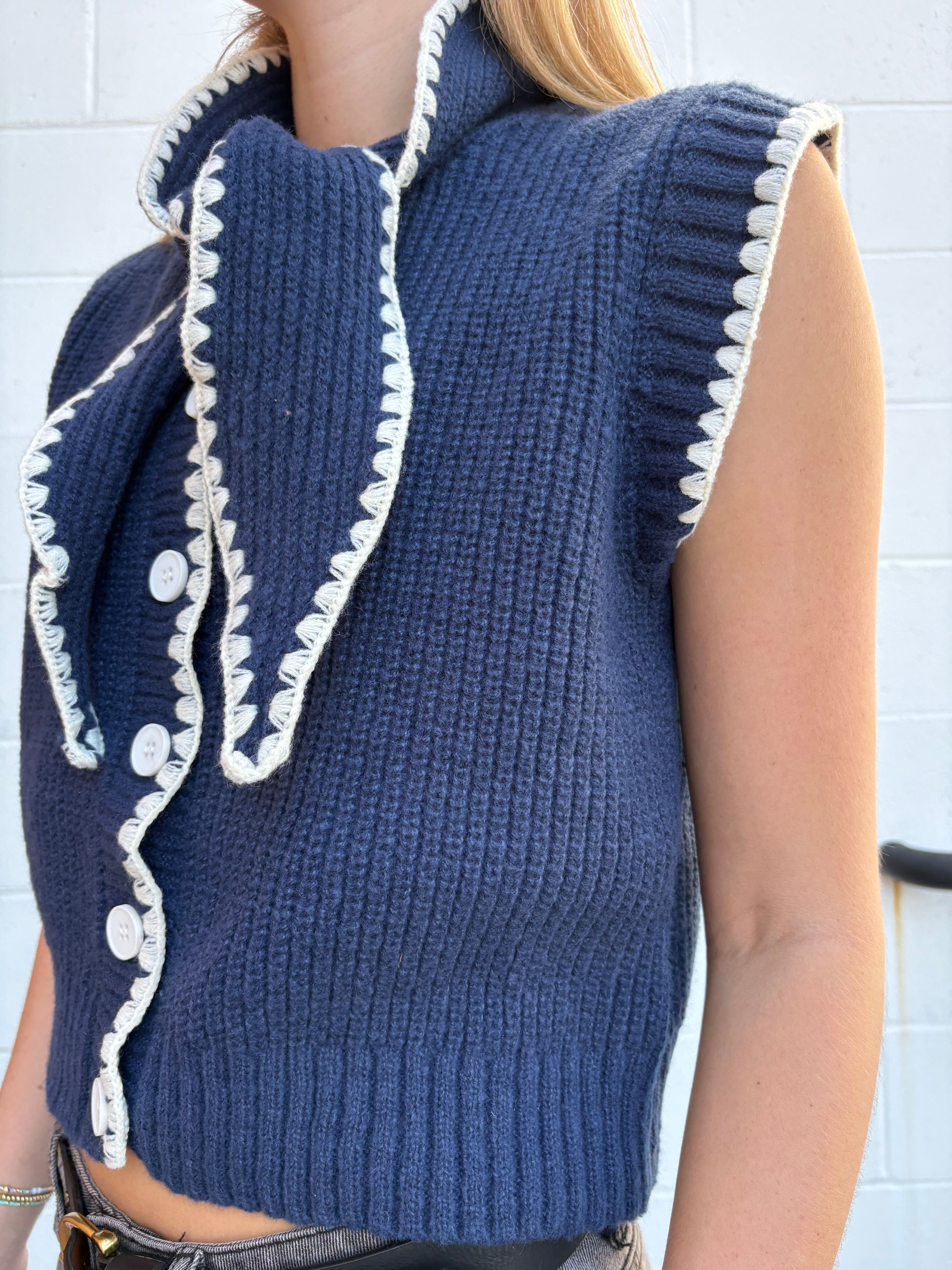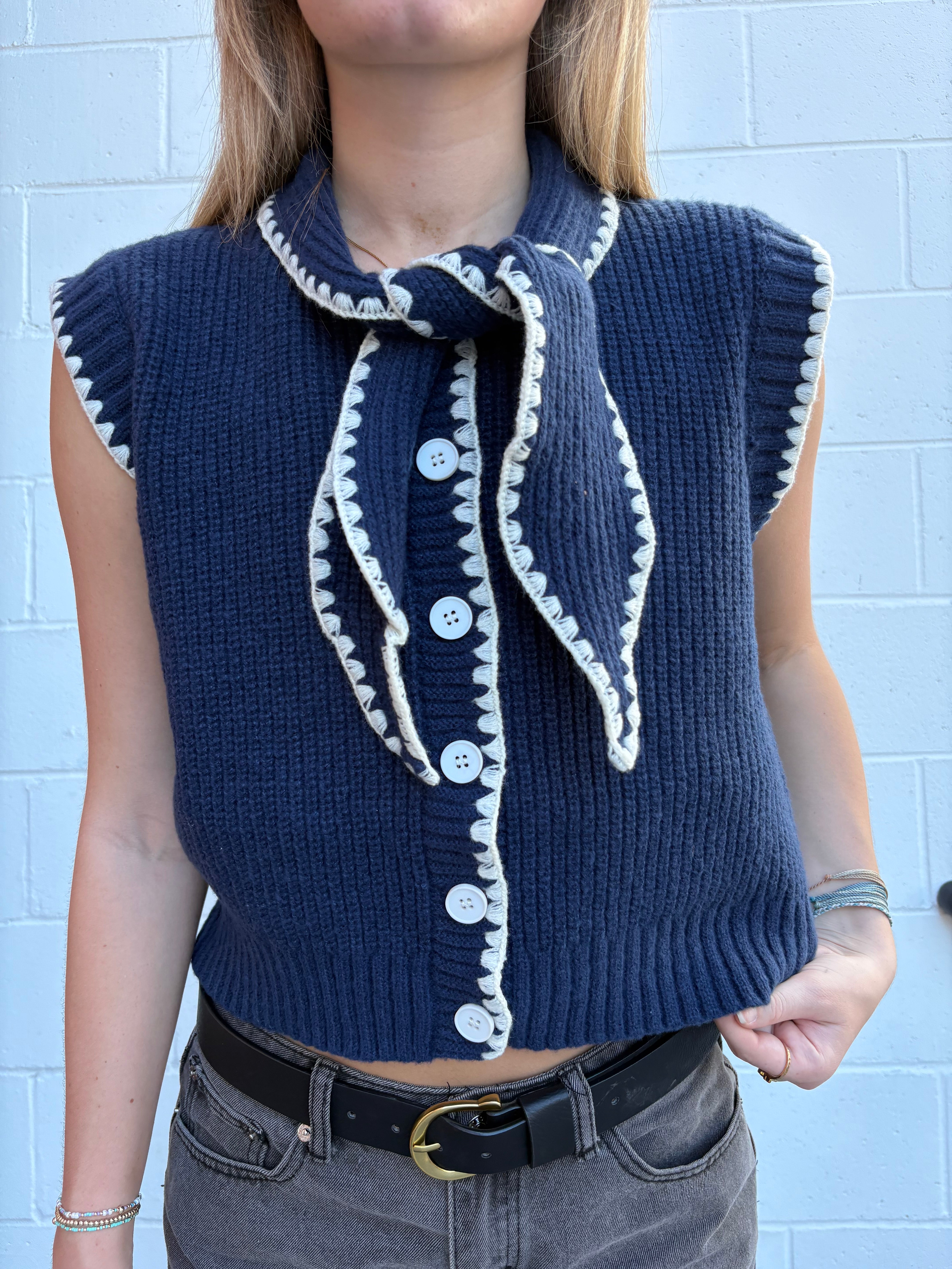 Navy & white, Effortlessly elevate your style with a piece that blends cozy texture and bohemian charm. This sleeveless knit features a stylish tying neckline and full button-down sweater Vest, The soft knit is beautifully contrasted by a charming blanket triangle stitch detail on all edges, giving it a unique, artisanal finish.