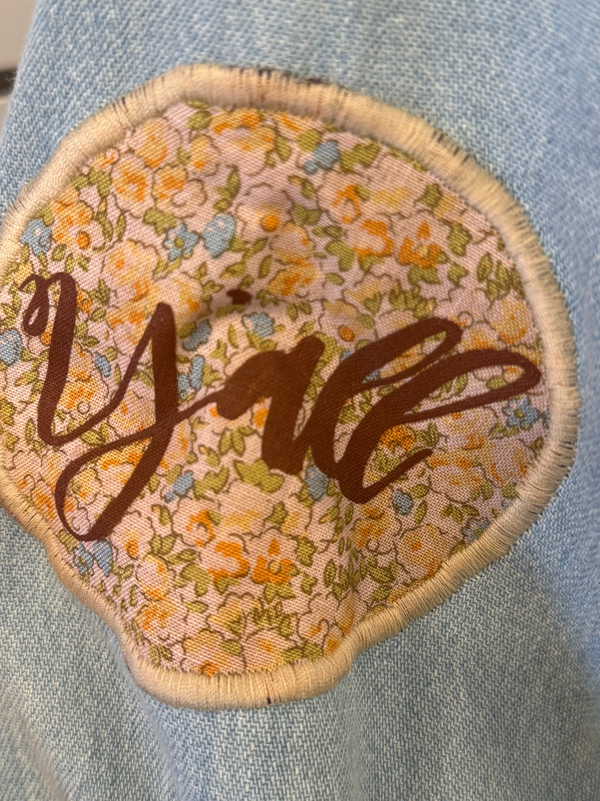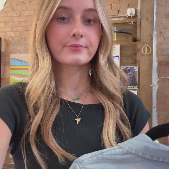 Handcrafted denim chambray button-up with snap buttons & unique rhinestone detail. Custom patch, unique stitching, and treatments ensure a one-of-a-kind feel.Each piece is custom-treated for a unique look.