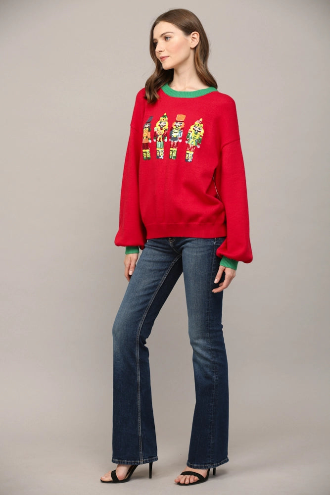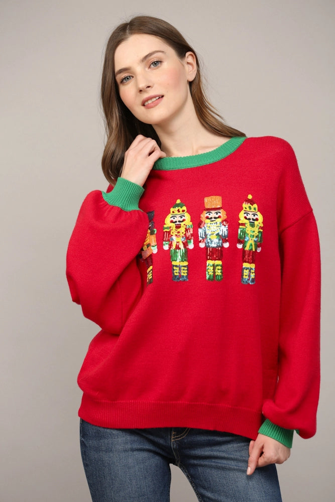 Step into the season with our dazzling Sequin Embellished Nutcracker Sweater! This merry knit features a charming nutcracker design, brought to life with sparkling sequins. The ultra-soft blend of 53% Rayon, 32% Polyester, and 15% Nylon ensures lightweight warmth and comfort for all your holiday parties and