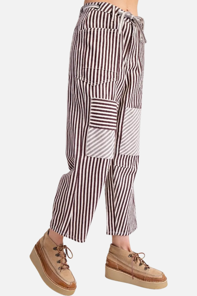 The standout feature is the unique multi-directional stripe pattern with patchwork details, giving them a fun, artistic look. With a cropped length, a convenient drawstring, and belt loops, these versatile pants can be styled for any occasion.