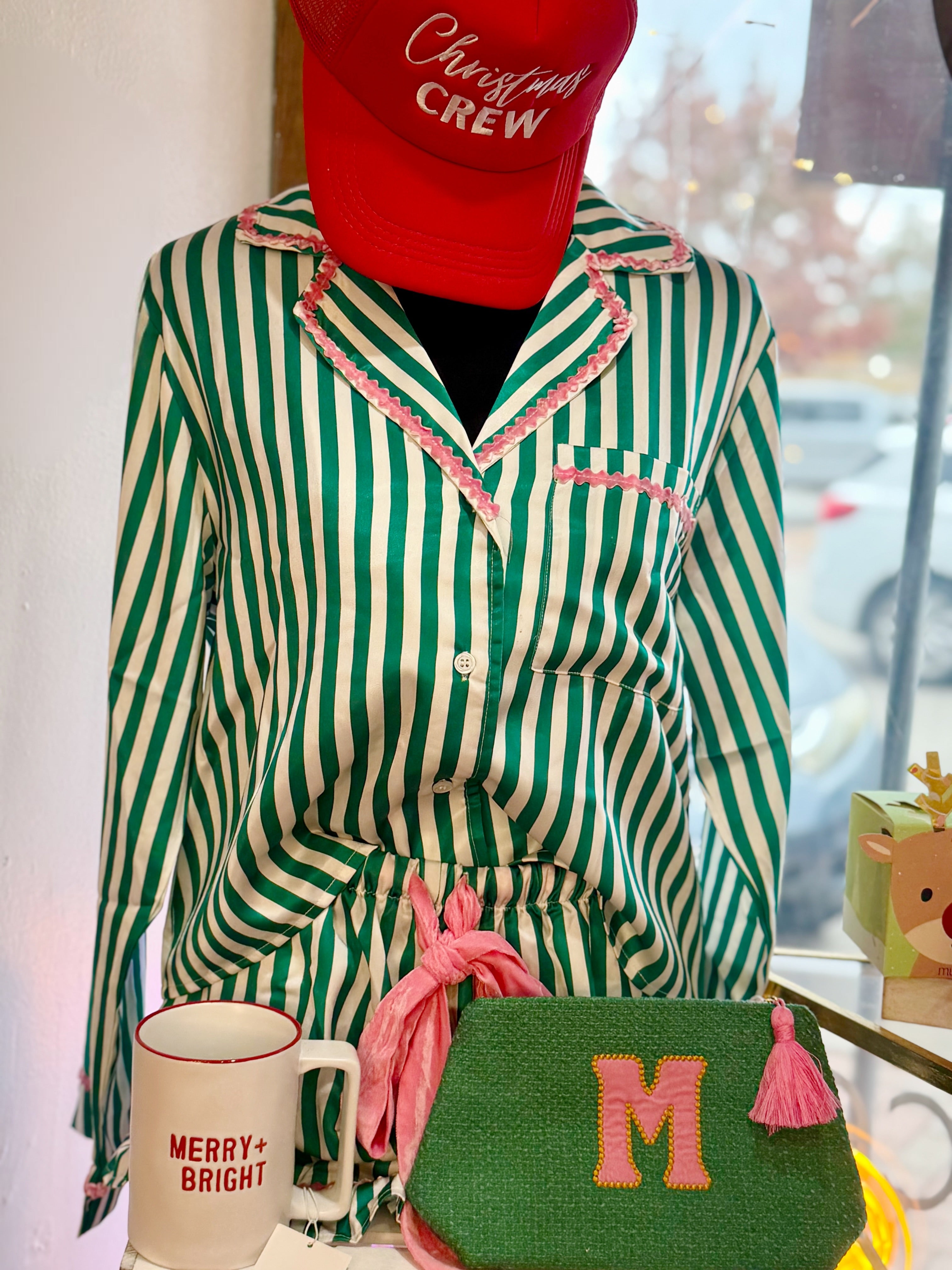 Luxuriously soft and bright, this satin pajama set features crisp kelly green stripes for a festive look. The long-sleeve button-down top boasts "Merry and Bright" embroidery elegantly stitched across the back shoulders. The matching bottoms include convenient pockets and a chic pink velvet ribbon tie at the waistband for a perfect, cozy fit. The ultimate treat for sleeping or lounging in style!